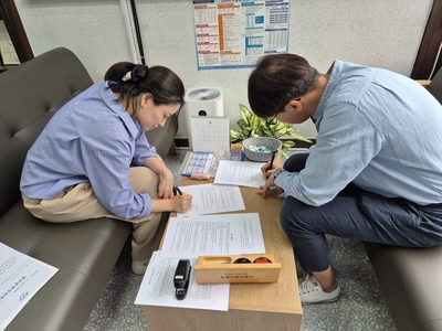 계약서에 신중하게 날인하는 우리 중개사님.
